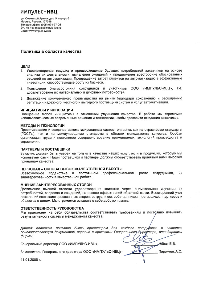 | 12 | Поощрение любой инициативы в отношении улучшения качества, использование самых современных решений и технологий, чтобы превзойти ожидания заказчиков. | Измеряется долей принятых предложений по отношений к выдвинутым. | Ответственный – Генеральный директор. | 50%-ое принятие выдвигаемых предложений. |