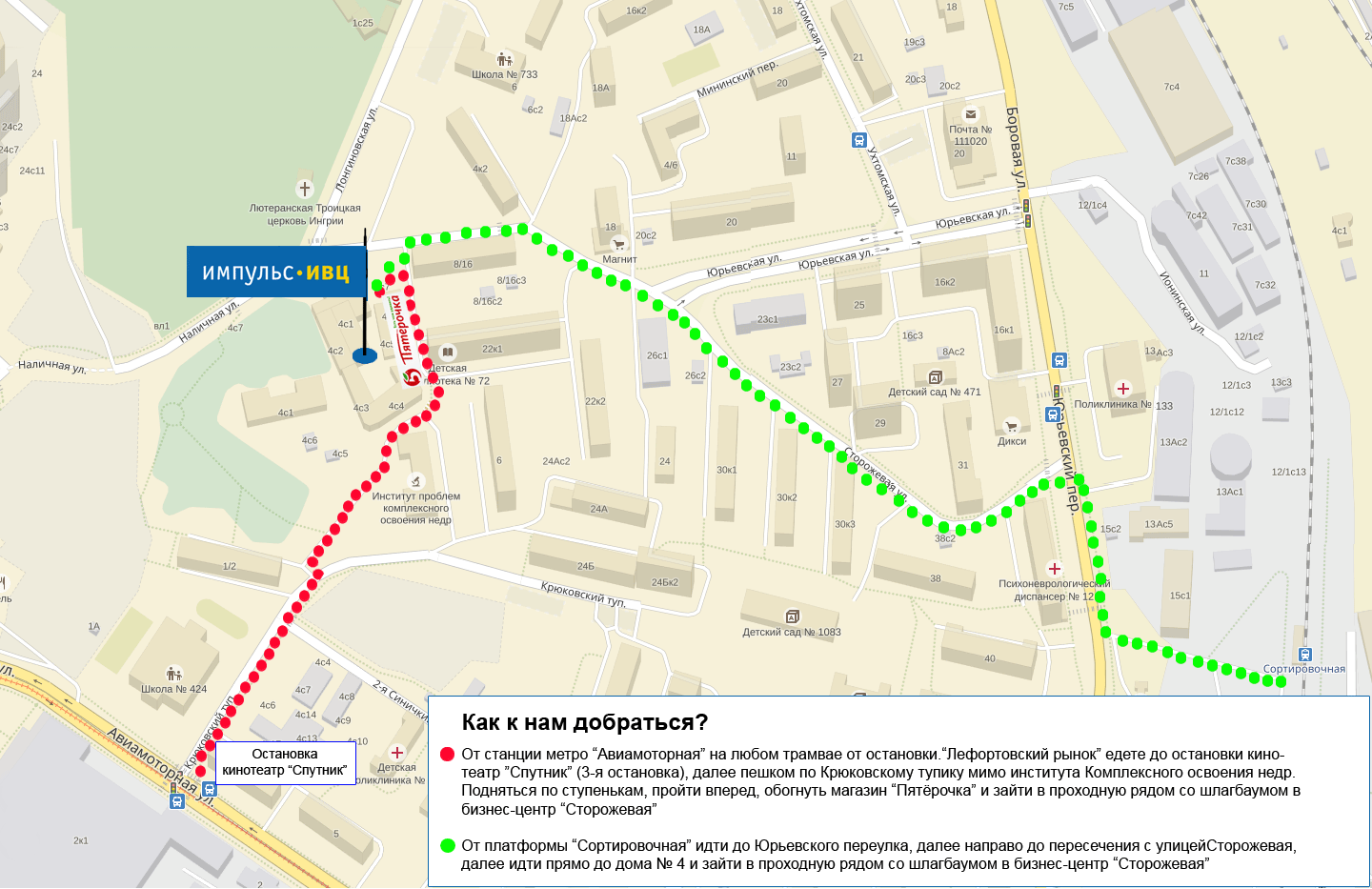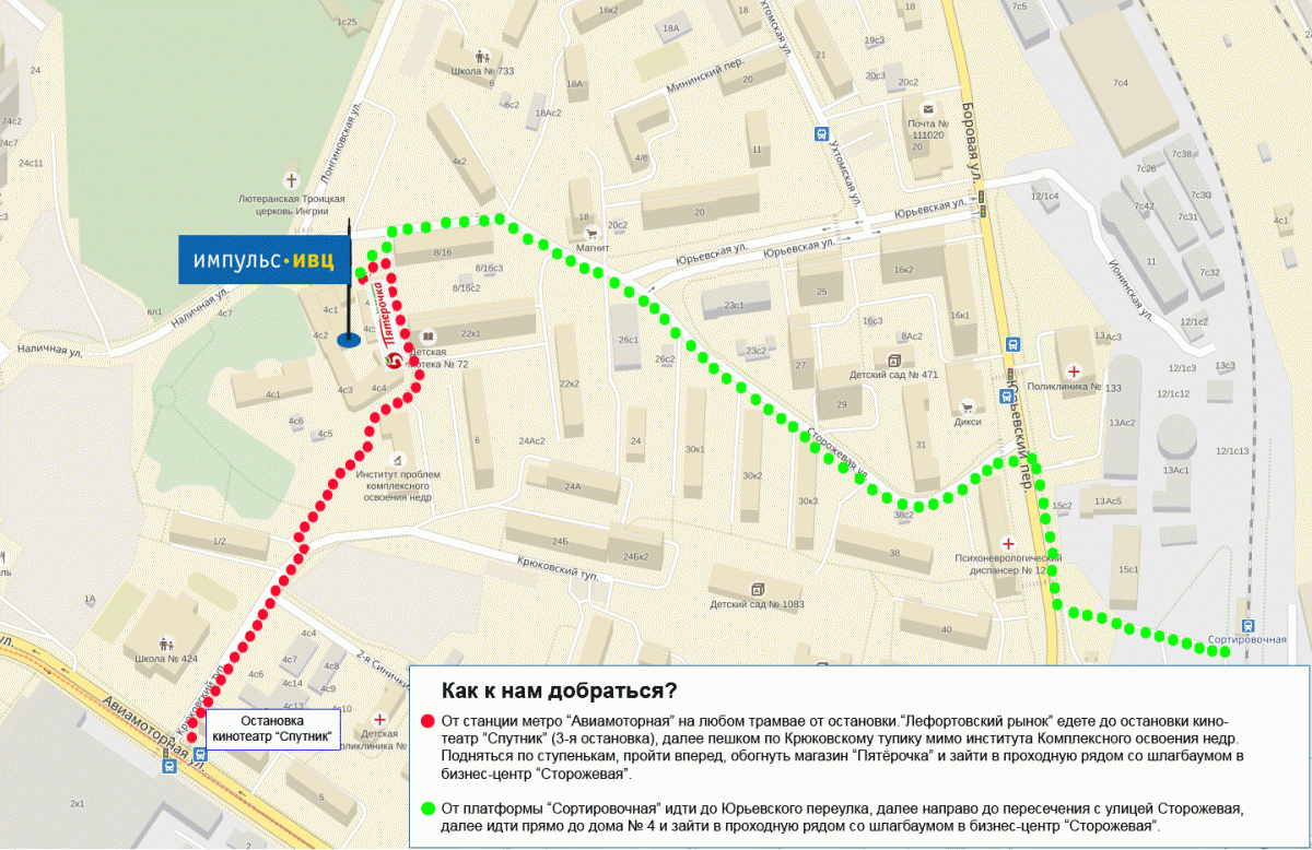 Ехать по Шоссе Энтузиастов до пересечения с ул. Авиамоторной, далее по ул. Авиамоторной, по Юрьевскому пер., поворот налево на ул. Сторожевая.