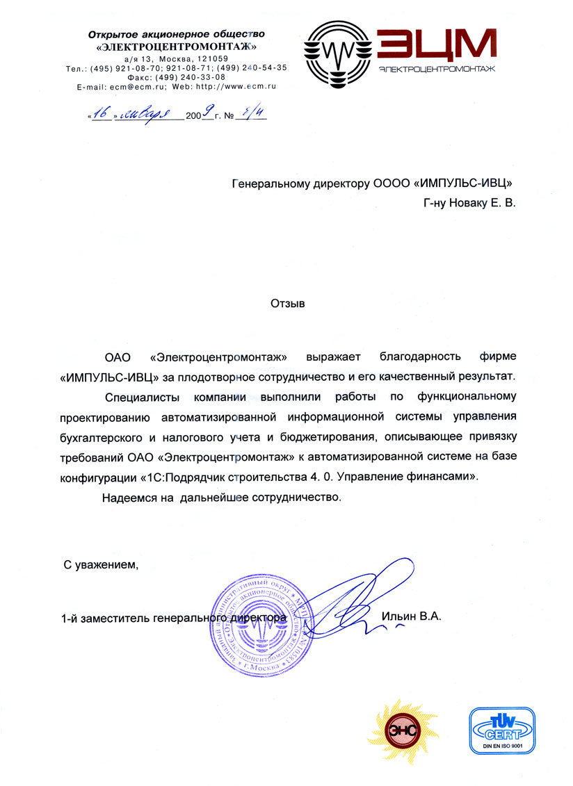 Руководство ОАО «Электроцентромонтаж» выразило благодарность фирме «ИМПУЛЬС-ИВЦ» за качественный результат и отметило высокий профессиональный уровень сотрудников.