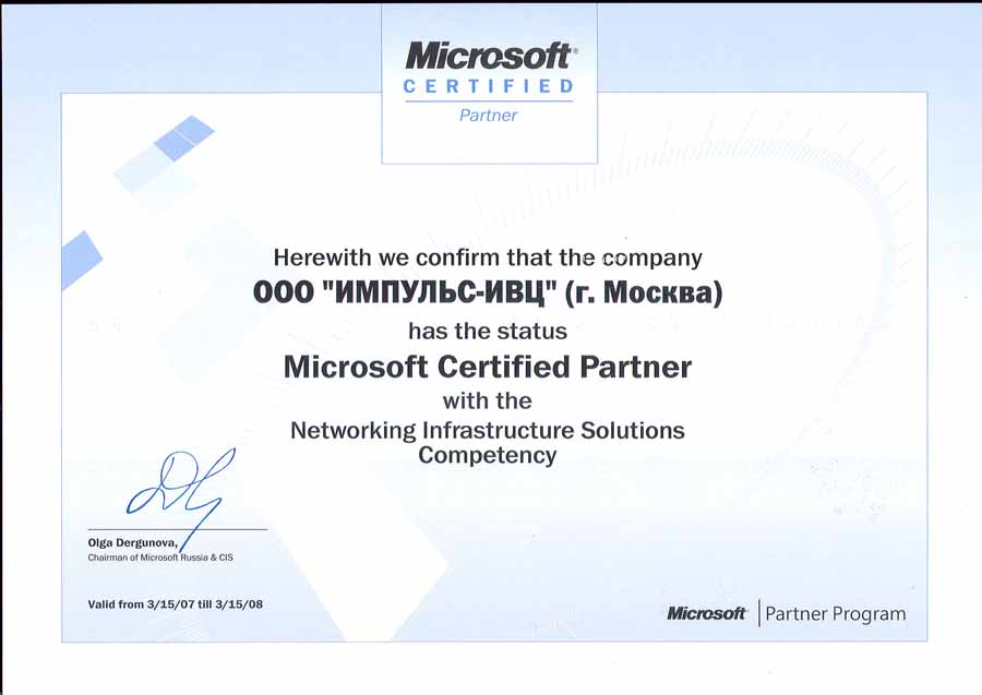 - В прошедшем году компании был присвоен статус сертифицированного партнера Microsoft по решениям в области построения сетевой инфраструктуры - Microsoft Certified Partner with the Networking Infrastructure Solutions. Фирма получила сертификат авторизованного партнера Fujitsu Siemens Computers, подтверждающий членство в клубе PRIMERGY в статусе БИЗНЕС.