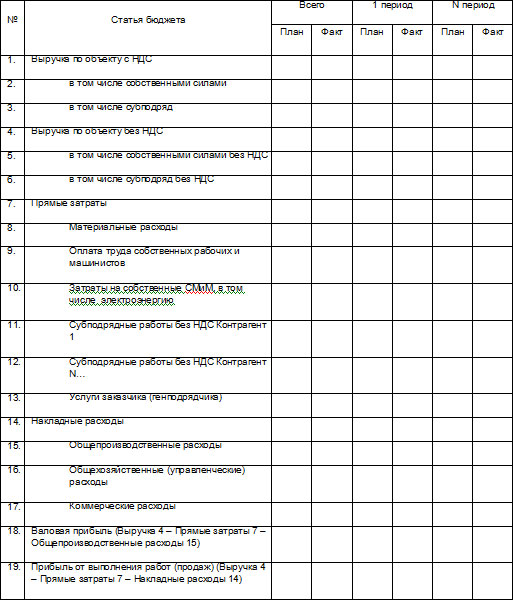 Приведем пример формы бюджета проекта для подрядной организации. Такая форма бюджета будет удобна при автоматизированной трансформации сметной документации в бюджет проекта.