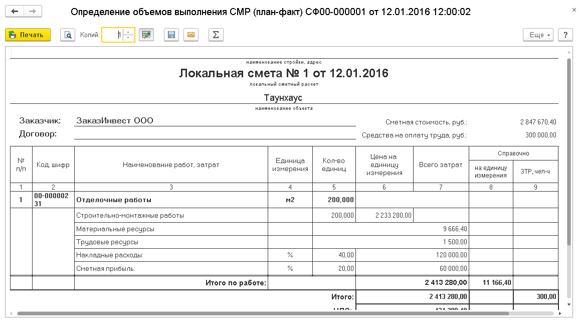 - Возможность печати комплекта первичных документов по учету капитальных вложений, незавершенного производства объектов строительства, учету ТМЦ и прочих документов, используемых заказчиком строительства, утвержденных Постановлениями Росстата;