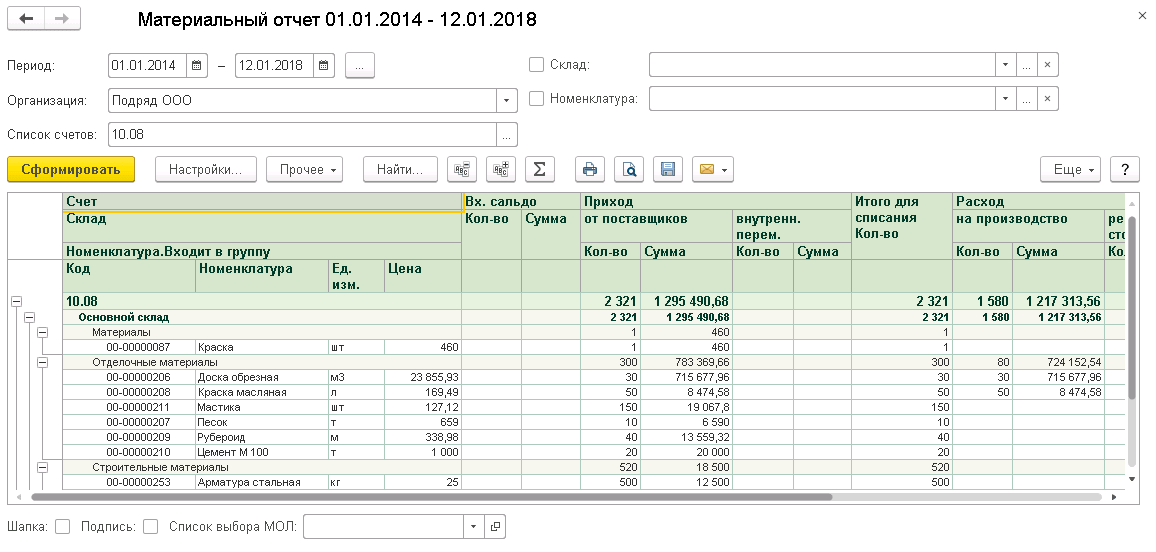 - Формирование отраслевой унифицированной формы по учету спецодежды и инвентаря "Карточка учета спецодежды", отчетов по движению материалов: "Ведомость 10-с", "Материальный отчет";