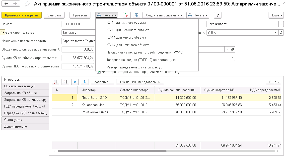 - Учет операций по передаче инвесторам законченных строительством объектов с оформлением актов КС-11 и КС-14;