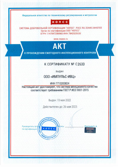 Компания «ИМПУЛЬС-ИВЦ» тщательно следит за соблюдением стандартов ISO. Ежегодно мы проходим инспекционный контроль по менеджменту качества ГОСТ Р ИСО 9001-2015.