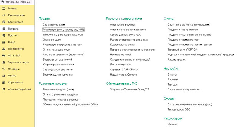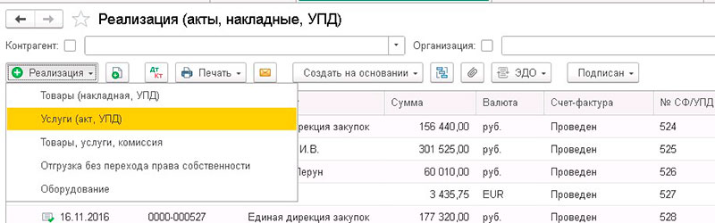 Переходим в меню «Продажи» - «Реализация (акты, накладные, УПД) и нажимаем кнопку создания нового документа «Реализация» - «Услуги (акт, УПД).