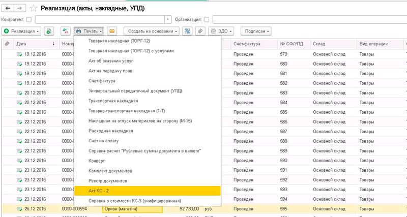 После установки расширения в программном продукте «1С:Бухгалтерия 8» появляется возможность печати форм КС-2, КС-3 из документов «Реализация (акты, накладные, УПД)».