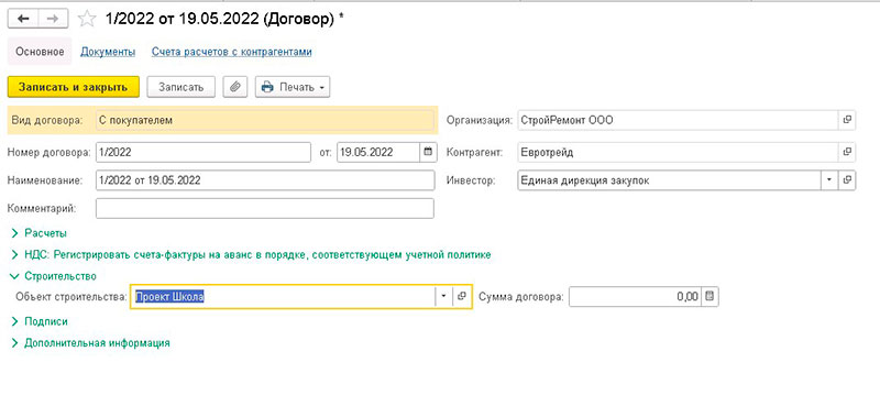 В договоре, по сравнению с типовым функционалом, появилась возможность указать Инвестора. А также есть вкладка «Строительство», в которой необходимо указать объект строительства из справочника «Объекты строительства» и сумму договора, которая далее будет отражена в печатных формах.