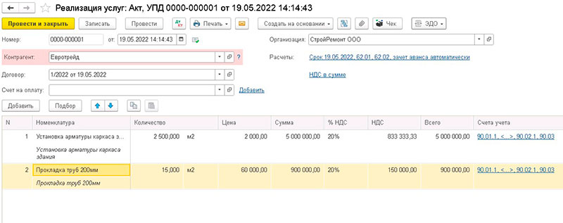 После добавления указанных данных необходимо заполнить табличную часть выполненными работами, которые должны отражаться в документе «Акт КС-2».