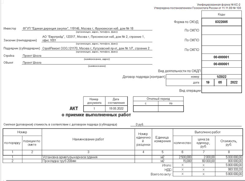 Далее нажимаем «Печать» - «Акт КС-2», выводится форма КС-2 для печати.