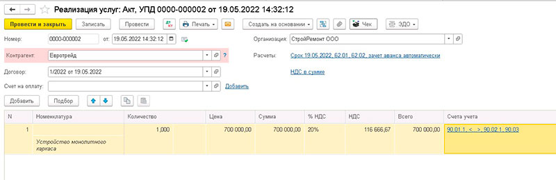 Переходим в меню «Продажи» - «Реализация (акты, накладные, УПД) и нажимаем кнопку создания нового документа «Реализация» - «Услуги (акт, УПД). Необходимо заполнить поля, указанные выше, аналогично заполнению для формы Акта КС-2.