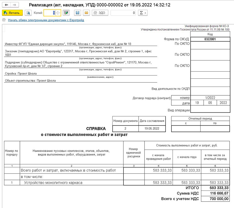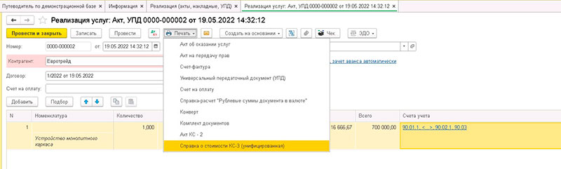 Выводится универсальная форма «Справка о стоимости КС-3».
