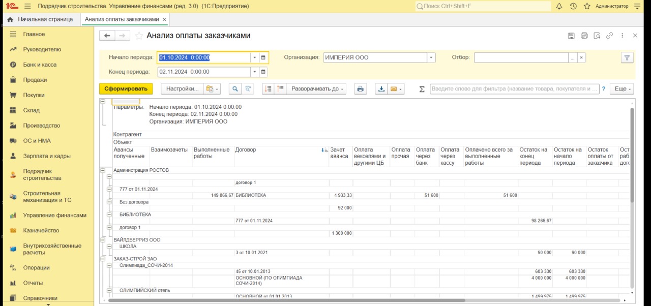 - Задолженность заказчика: по объектам и договорам (начальный и конечный остаток).
