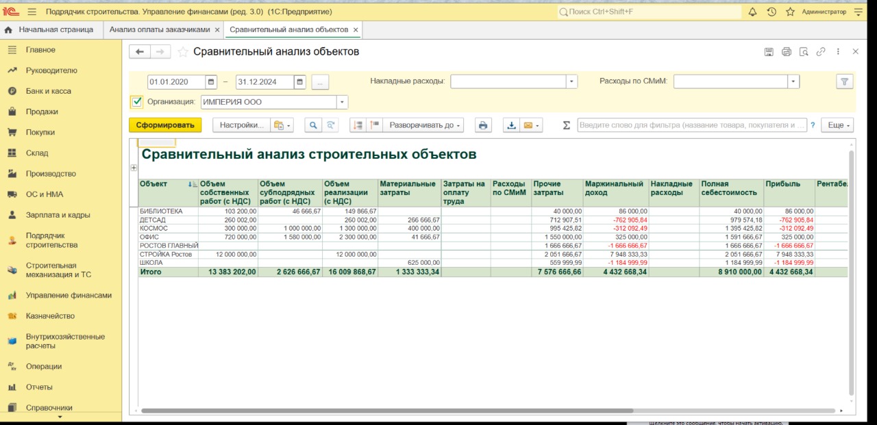 Предназначен для анализа данных по выполнению работ, затратам, прибыли и рентабельности по различным объектам. Пользователь выбирает организацию и период, а также может установить отбор по объекту строительства (номенклатурной группе). Готовый отчет можно распечатать или сохранить в формате электронной таблицы.