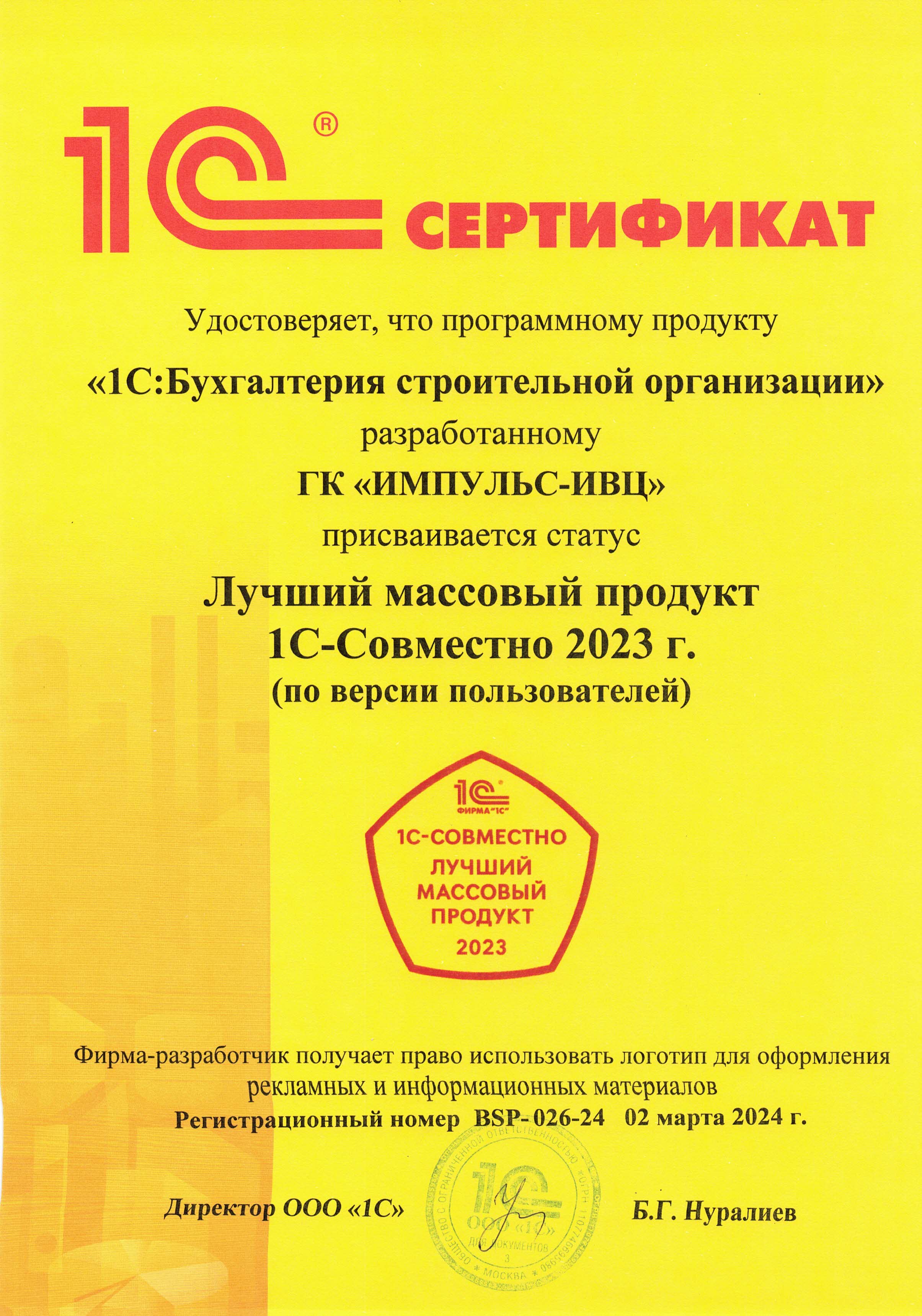 2-3 марта 2024 года ГК «ИМПУЛЬС-ИВЦ» приняла участие в ежегодном партнерском семинаре компании «1С», который проходил в городе Москва. По итогам 2023 года наш продукт «1С:Бухгалтерия строительной организации 8» был удостоен знака отличия и сертификата «Лучший продукт 1С-Совместно 2023» по мнению пользователей. «1С:Бухгалтерия строительной организации» разработана для автоматизации бухгалтерского и налогового учета субъектов инвестиционной деятельности, имеющих право совмещать функции двух и более субъектов. Для ознакомления с функциональными возможностями продукта приглашаем посмотреть вебинар .