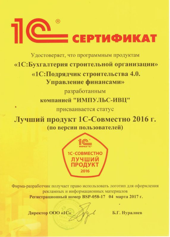 | Сертификат «1С», подтверждающий, что «Программный продукт «1С:Подрядчик строительства. Управление финансами», разработанный фирмой ООО «ИМПУЛЬС-ИВЦ», признан совместимым с системой программ «1С:Предприятие 8» | ![]() |